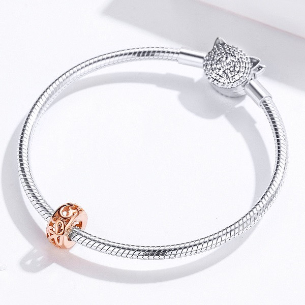 Vyrobené zo striebra, s prelamovaným zdobením, na prívesný náramok a náhrdelník. Veľkosť 1 x 1 cm Prívesok je kompatibilný s náramkami typu Pandora a Pandora.