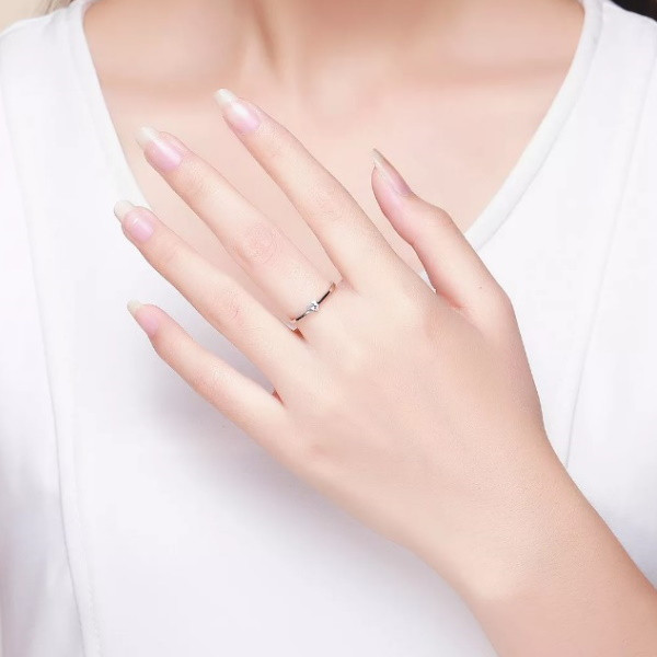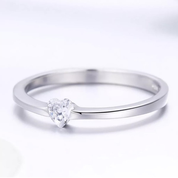 Zásnubný prsteň vyrobený zo striebra, zdobený bielym zirkónovým kryštálom. Jeho hrúbka je 0,2 cm.