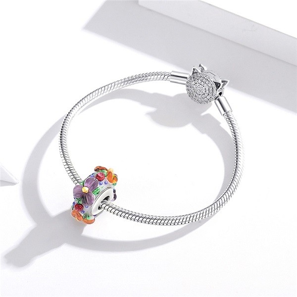 Vyrobené zo striebra, zdobené farebnými sklenenými kvietkami, na náramku a náhrdelníku. Veľkosť 1,8 cm Prívesok je kompatibilný s náramkami typu Pandora a Pandora.