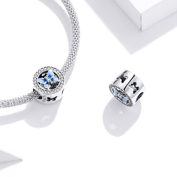 Vyrobené zo striebra, zdobené modrým motýľom a bielym zirkónovým kryštálom, na náramku a náhrdelníku. Veľkosť 1,1 x 0,8 cm Prívesok je kompatibilný s náramkami typu Pandora a Pandora.