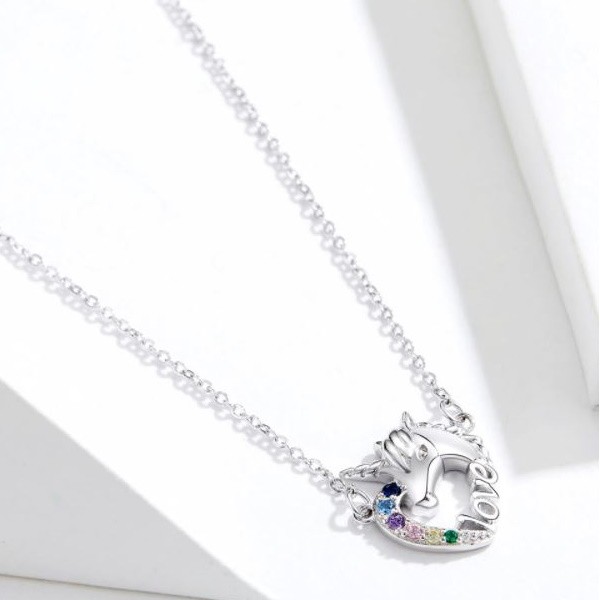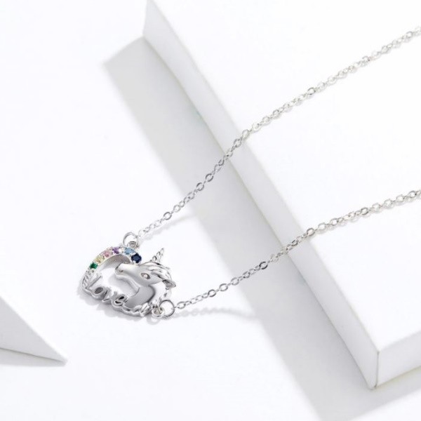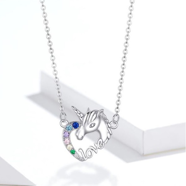 Náhrdelník zo striebra so srdiečkom a príveskom jednorožca. Dĺžka retiazky je 45 cm, váha 2,7 g.