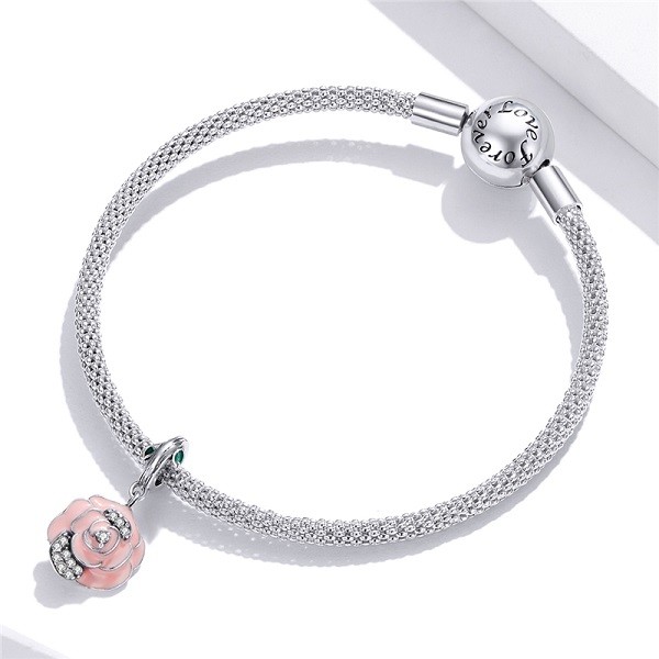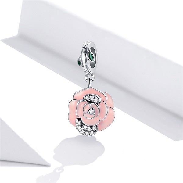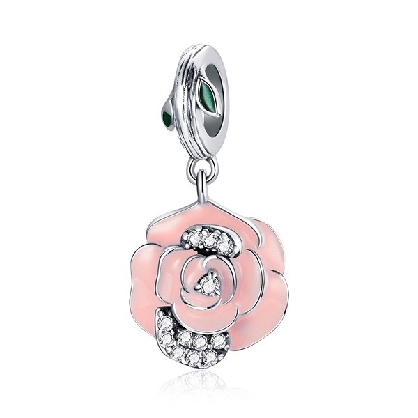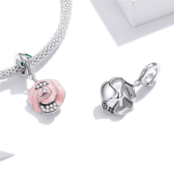 Prívesok zo striebra s vyobrazením ružového kvietku, zdobený bielym zirkónovým kryštálom, na náramok a náhrdelník. Veľkosť 2 x 1 cm Prívesok je kompatibilný s náramkami typu Pandora a Pandora.