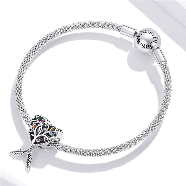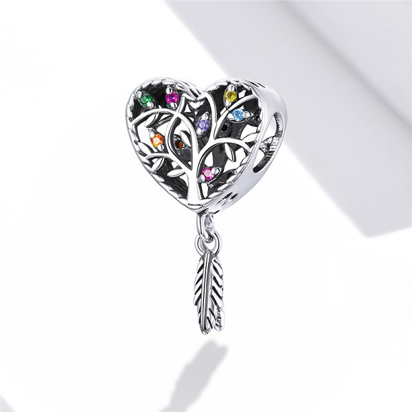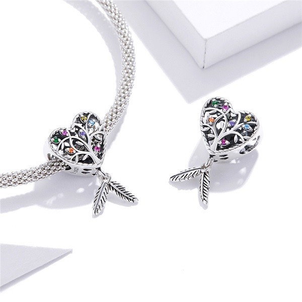 Kúzlo znázorňujúce strom života v srdci, vyrobené zo striebra, zdobené farebnými zirkónovými kamienkami. Dá sa nosiť na náramku alebo náhrdelníku. Rozmer 2,1 x 1,2 cm je kompatibilný s náramkami typu Pandora a Pandora Boh ich vyhnal zo svojho stromu, aby nedostali večný život