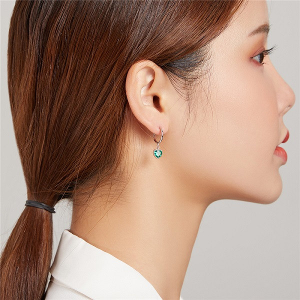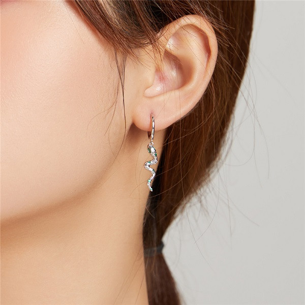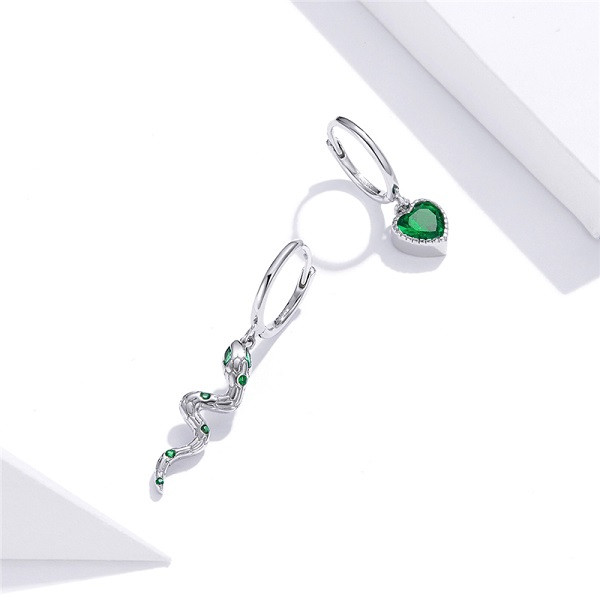Náušnice s vyobrazením hada a srdca, vyrobené zo striebra, zdobené zeleným zirkónovým kryštálom. Veľkosť 2,2 x 1,2 cm, váha 2,3 g.
