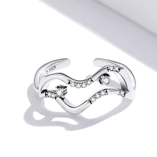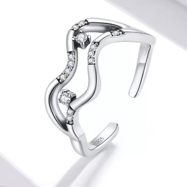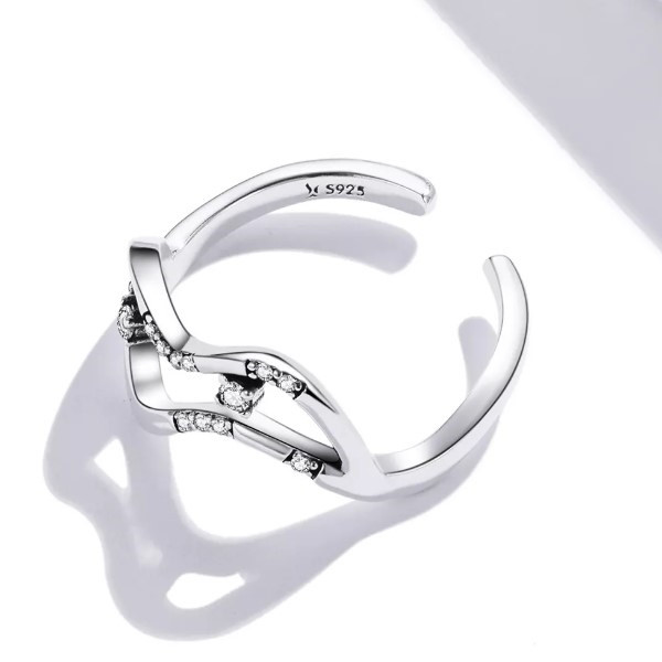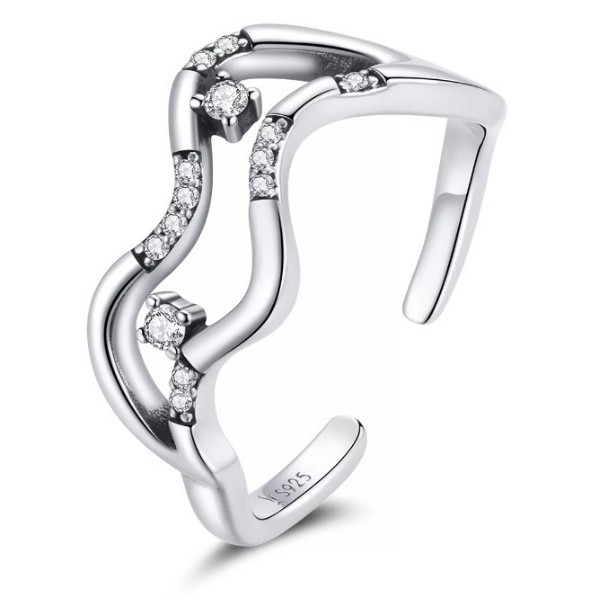 Otvorený prsteň zo striebra, zdobený bielym kryštálom zirkónu, abstraktný tvar. Jeho hrúbka je 0,2-0,9 cm, hmotnosť je 2,1 g.