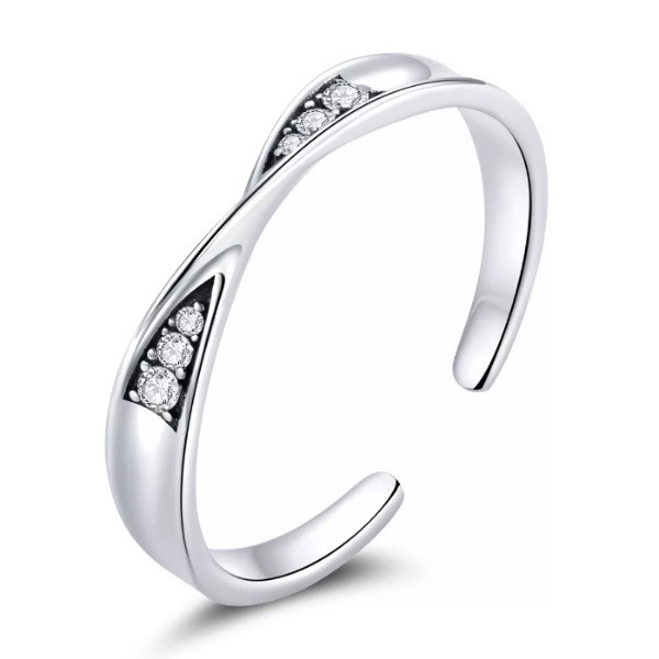 Elegantný dámsky prsteň vyrobený zo striebra, zdobený bielym zirkónovým kryštálom. Jeho hrúbka je 0,3 cm, hmotnosť 1,4 g.