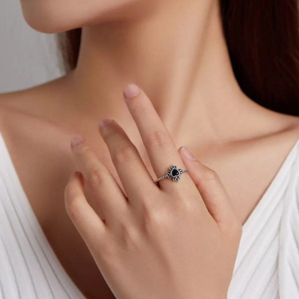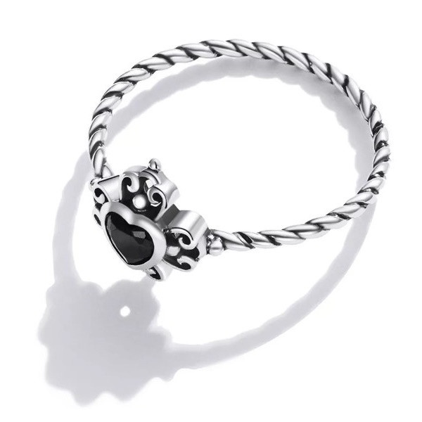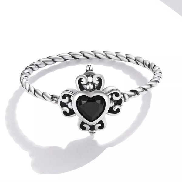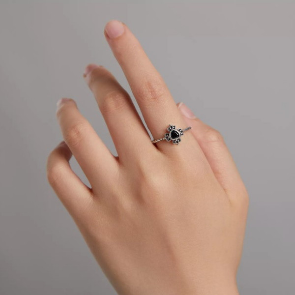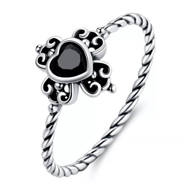 Dámsky prsteň vo vintage štýle vyrobený zo striebra zdobený čiernym zirkónovým kryštálom. Jeho hrúbka je 0,1 cm, hmotnosť 1,3 g.