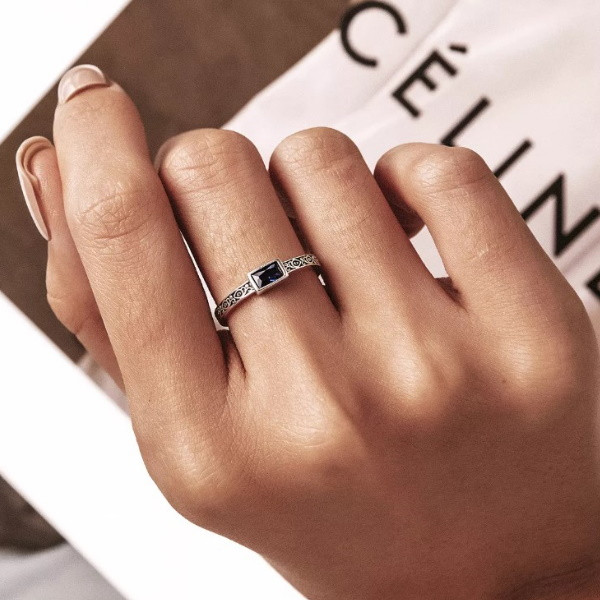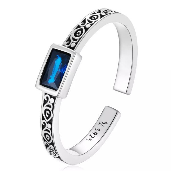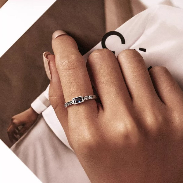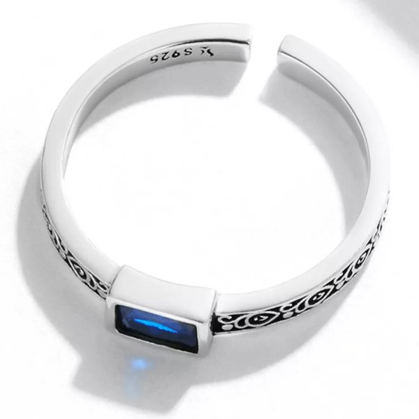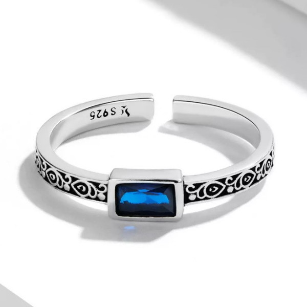 Dámsky prsteň vyrobený zo striebra zdobený modrým zirkónovým kryštálom. Jeho hrúbka je 0,2 cm, hmotnosť 2 g.