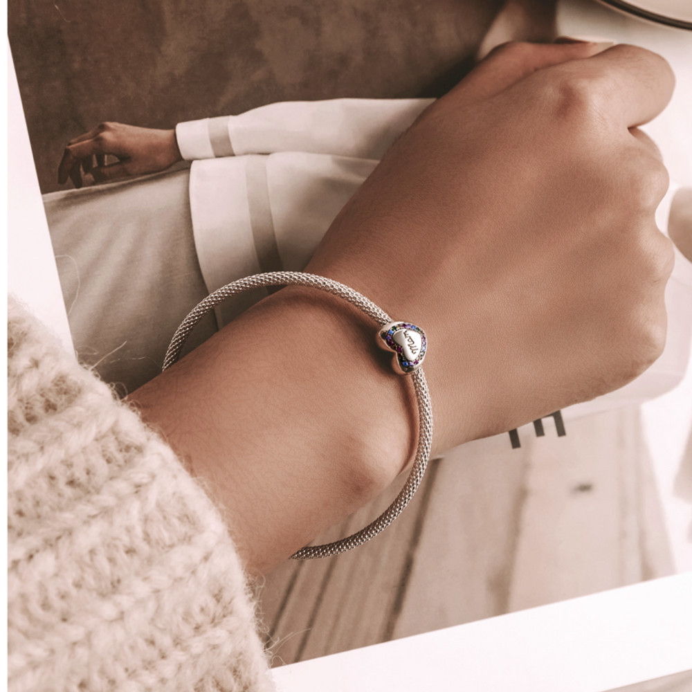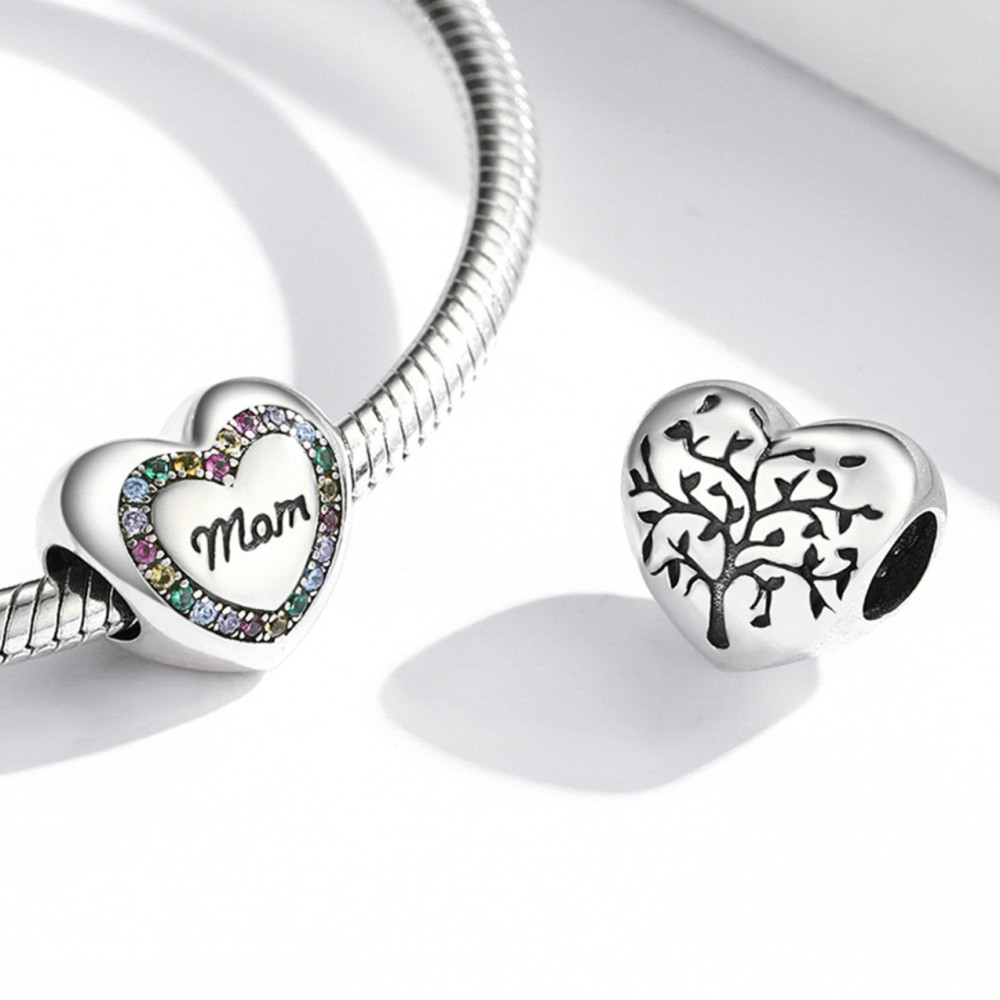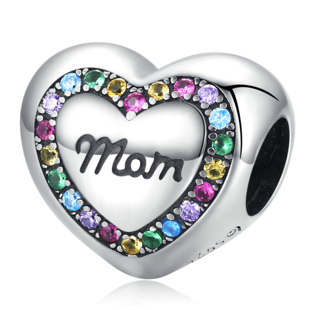 Strieborný kúzlo, srdce, s nápisom mama, s dúhovými kryštálmi