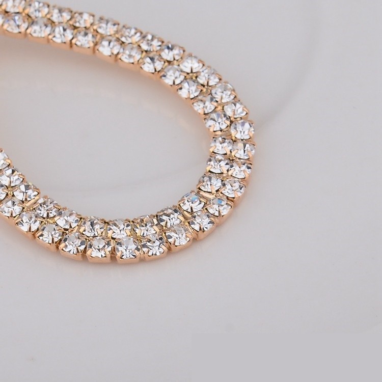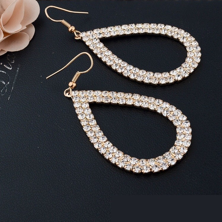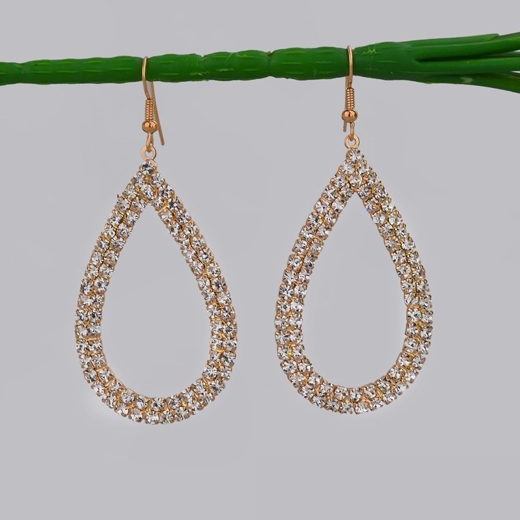 Visiace, pozlátené dámske náušnice v tvare kvapky posiate bielymi kryštálmi. Jeho rozmer je 5,1 x 3,2 cm. Skvelé ako svadobný doplnok alebo darček k narodeninám.