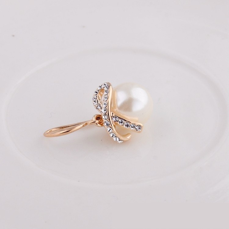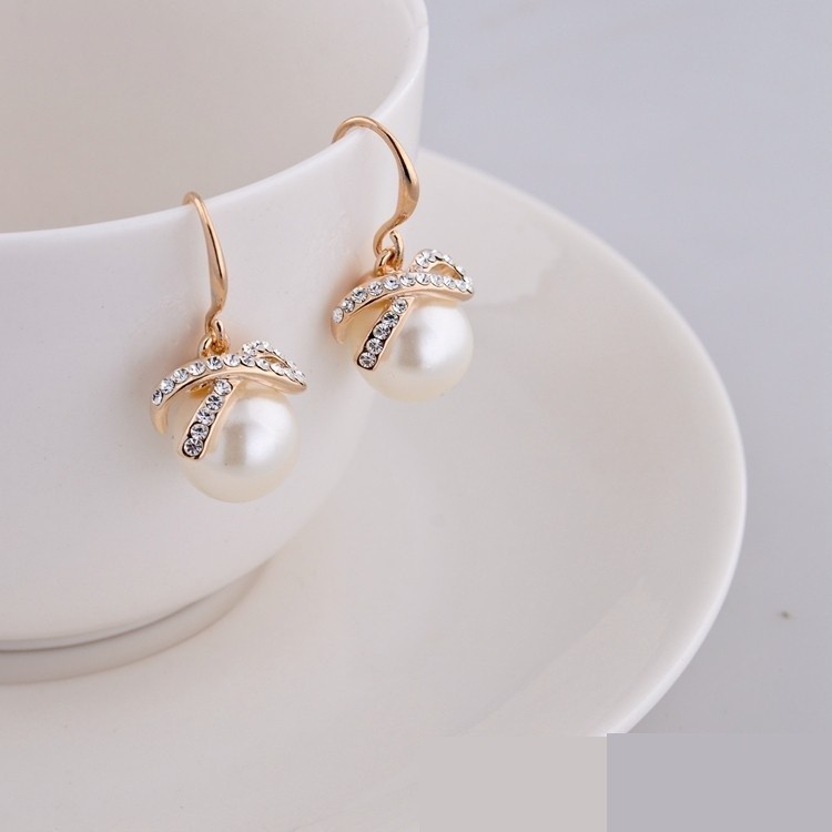 Pozlátené náušnice v tvare mašle zdobené bielymi kryštálmi a jednou bielou perlou. Veľkosť 2,7 X 1,5 cm.