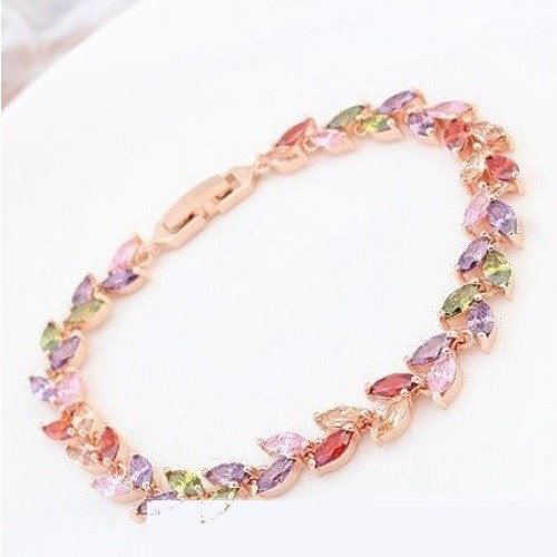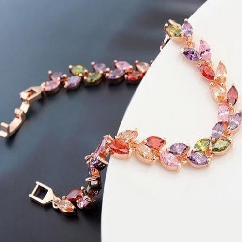 Módny pozlátený náramok v tvare listu s farebnými zirkónovými kameňmi.