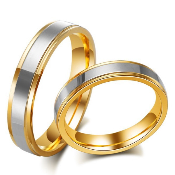 Pánsky snubný prsteň z ušľachtilej ocele zlatej farby so striebornou vsadkou v strede. Šírka obrúčky je 6,5 mm.