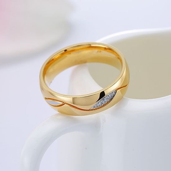 Dámsky snubný prsteň vyrobený z nerezovej ocele s pozlátením, zdobený geometrickým vzorom a bielym zirkónovým kryštálom. Jeho šírka je 6 mm.