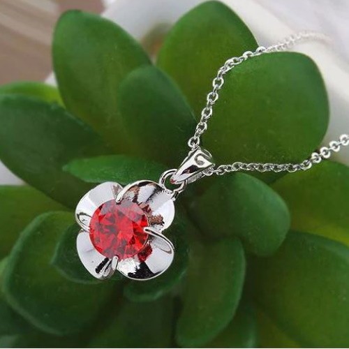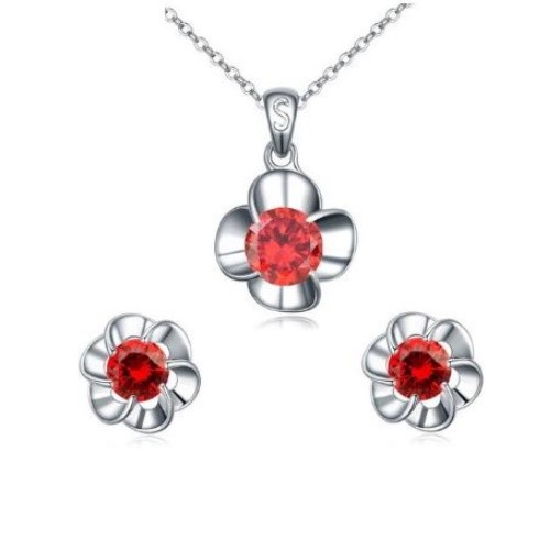 Náušnice a náhrdelník v tvare kvetu osadené červeným zirkónovým kameňom.