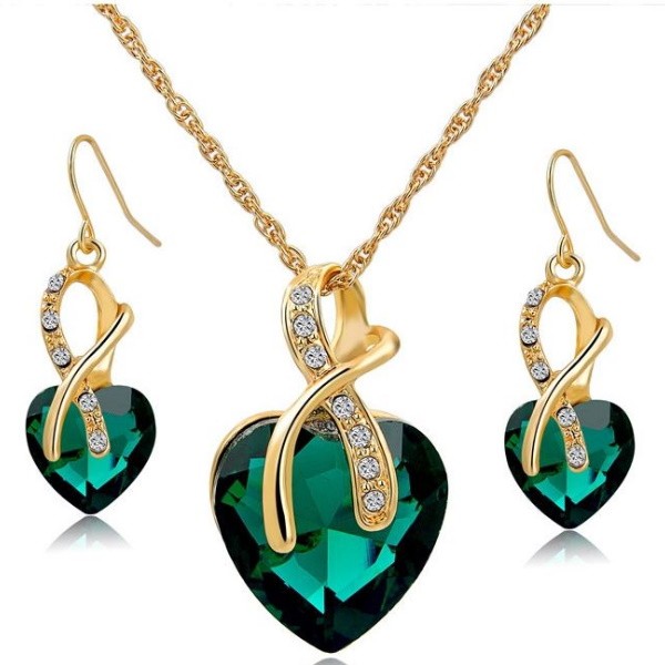 Pozlátená súprava náušníc a náhrdelníka v tvare srdca, zelená