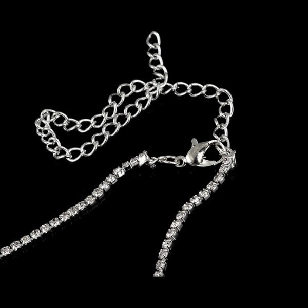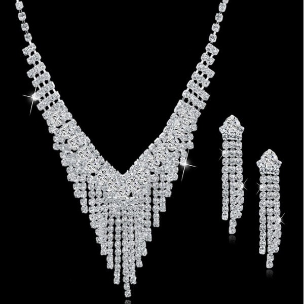 Visiace náušnice striebornej farby zo zinkovej zliatiny, zdobené drobnými kryštálmi, s ladiacim náhrdelníkom. Dĺžka náušníc je 5 cm, náhrdelník je 32 cm.