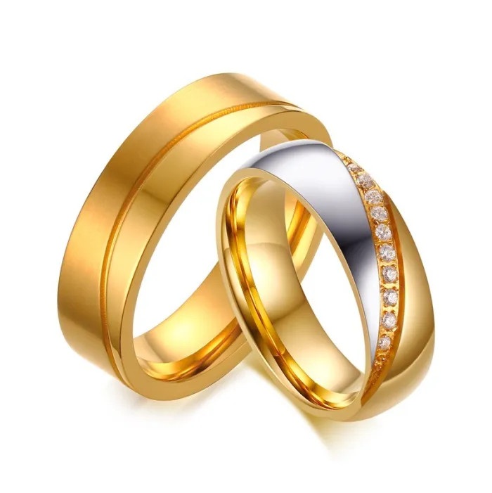 Dvojfarebný dámsky svadobný prsteň vyrobený z nerezovej ocele so zlatým povrchom, zdobený zirkónovým kryštálom. Jeho šírka je 6 mm. Snubný prsteň je vyrobený z masívnej nehrdzavejúcej ocele. Jeho farba je 100% odolná voči opotrebovaniu