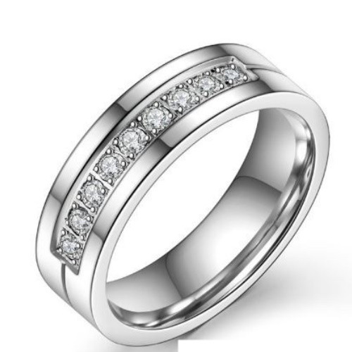 Dámsky svadobný prsteň z ušľachtilej ocele, lesklé striebro, zdobený drobnými bielymi kryštálmi zirkónu. Šírka prsteňa je 6 mm.