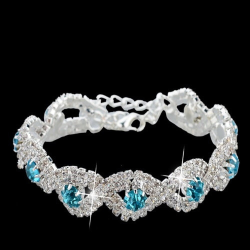 Dámsky náramok so zapínaním zdobený malými bielymi a väčšími modrými rakúskymi kryštálmi. Dĺžka 18,5 cm, šírka 1,3 cm, váha 8 g.