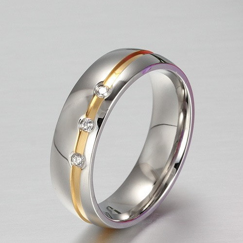 Dámska snubná obrúčka z ušľachtilej ocele v lesklej striebornej farbe, zdobená zlatým pásikom prechádzajúcim šikmo v strede a tromi malými kryštálmi. Obrúčka je široká 6 mm a váži 10 g.