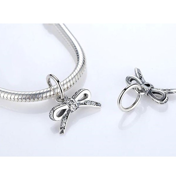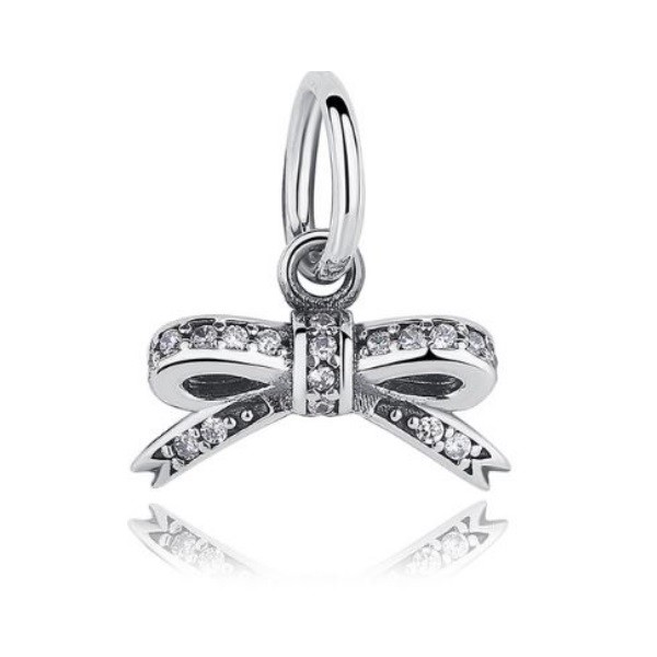 Prívesok strieborná mašlička, zdobený malými bielymi zirkónovými kamienkami, na náramok alebo náhrdelník. Veľkosť obrúčky je cca. 4 mm.
