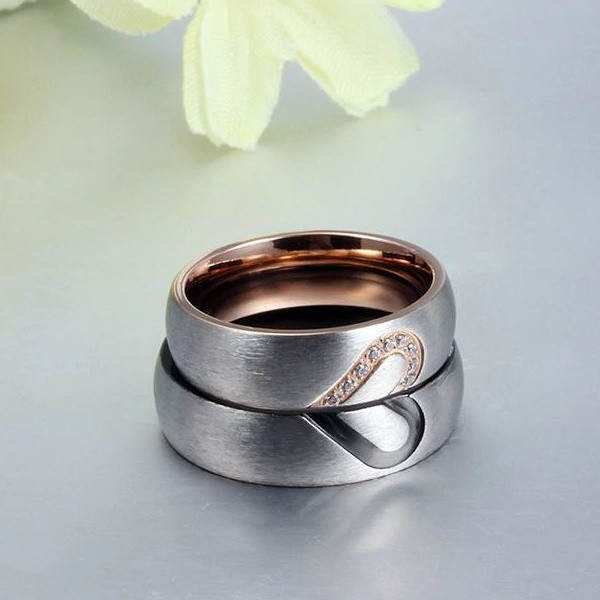Pánska snubná obrúčka vyrobená z nerezovej ocele zdobená polovicou srdca. Druhá polovica srdca je na zladenom dámskom prsteni. Šírka prsteňa je 6 mm. Prsteň je vyrobený z pevnej nerezovej ocele. Jeho farba je 100% odolná voči opotrebovaniu