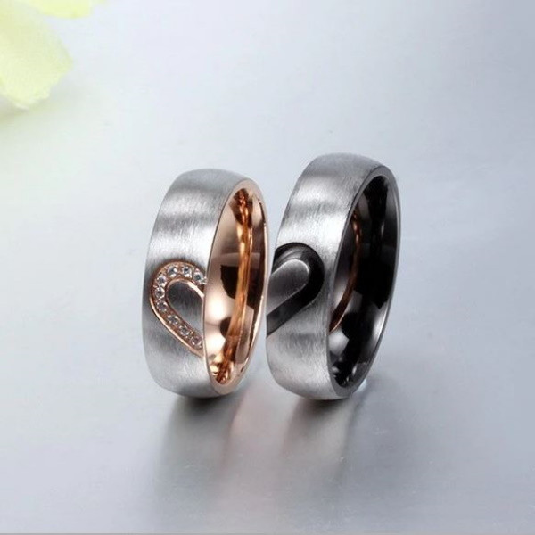 Pánska snubná obrúčka vyrobená z nerezovej ocele zdobená polovicou srdca. Druhá polovica srdca je na zladenom dámskom prsteni. Šírka prsteňa je 6 mm. Prsteň je vyrobený z pevnej nerezovej ocele. Jeho farba je 100% odolná voči opotrebovaniu