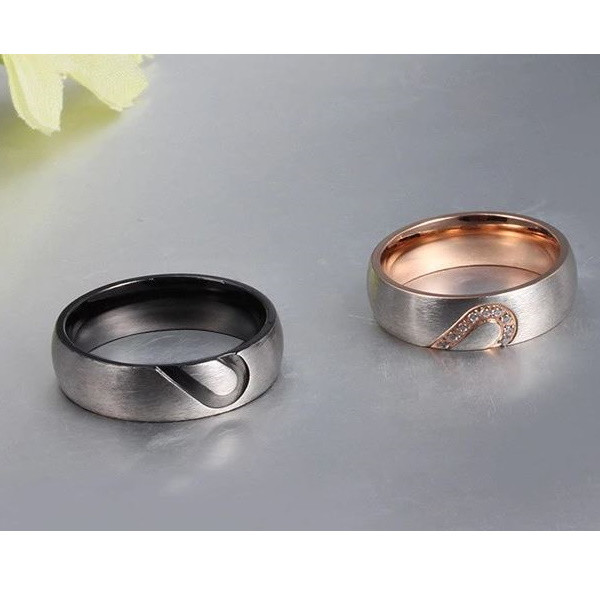 Pánska snubná obrúčka vyrobená z nerezovej ocele zdobená polovicou srdca. Druhá polovica srdca je na zladenom dámskom prsteni. Šírka prsteňa je 6 mm. Prsteň je vyrobený z pevnej nerezovej ocele. Jeho farba je 100% odolná proti opotrebovaniu