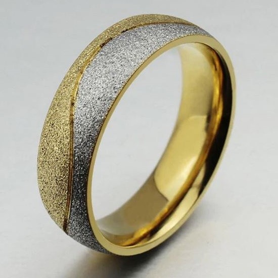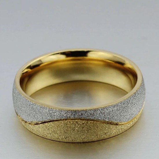 Pánska svadobná obrúčka vyrobená z nerezovej ocele, zdobená dvojfarebným abstraktným motívom. Šírka 6 mm, váha 9,5 g Snubný prsteň je vyrobený z pevnej, nerezovej ocele. Jeho farba je 100% odolná voči opotrebovaniu
