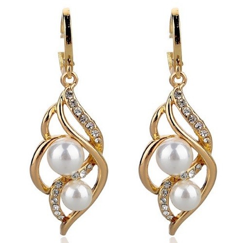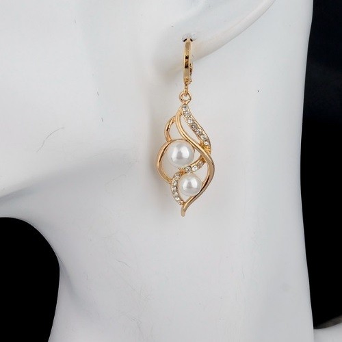 Závesné náušnice z ekologickej zliatiny zinku, s bielymi rakúskymi kryštálmi a jednou veľkou bielou perlou, v zlatej farbe. Jeho veľkosť je 4,5 cm.