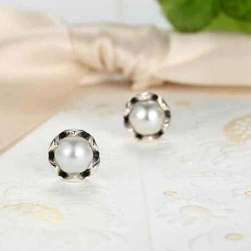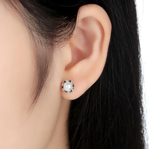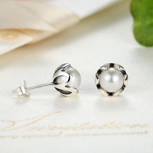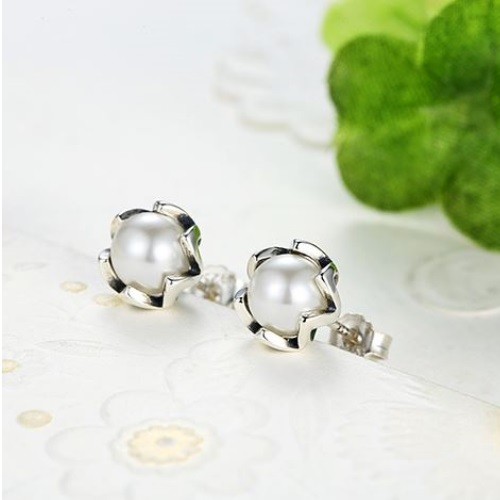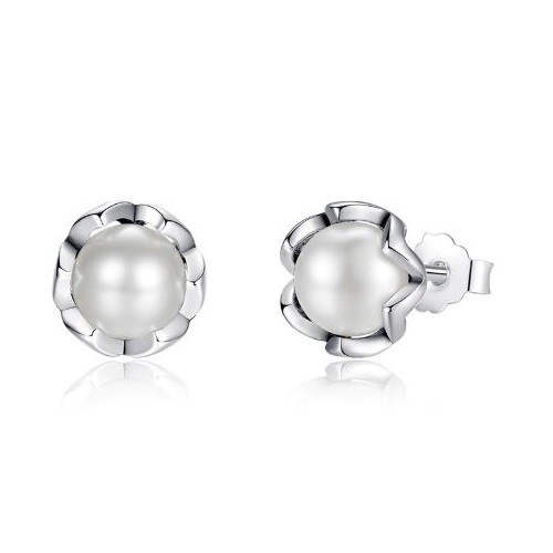 Krásne spracované zásuvné strieborné náušnice v tvare kvetu s bielou sladkovodnou perlou uprostred.