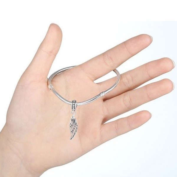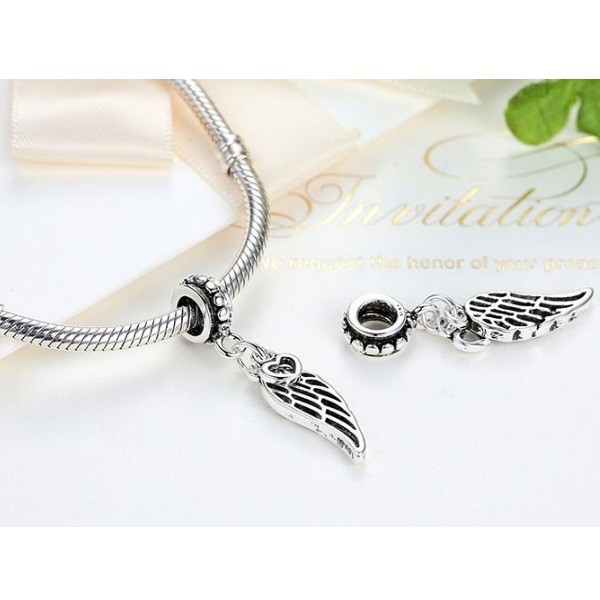 Postriebrený prívesok s anjelským krídlom, zdobený drobnými zirkónovými kamienkami. Jeho materiálom je zliatina zinku.