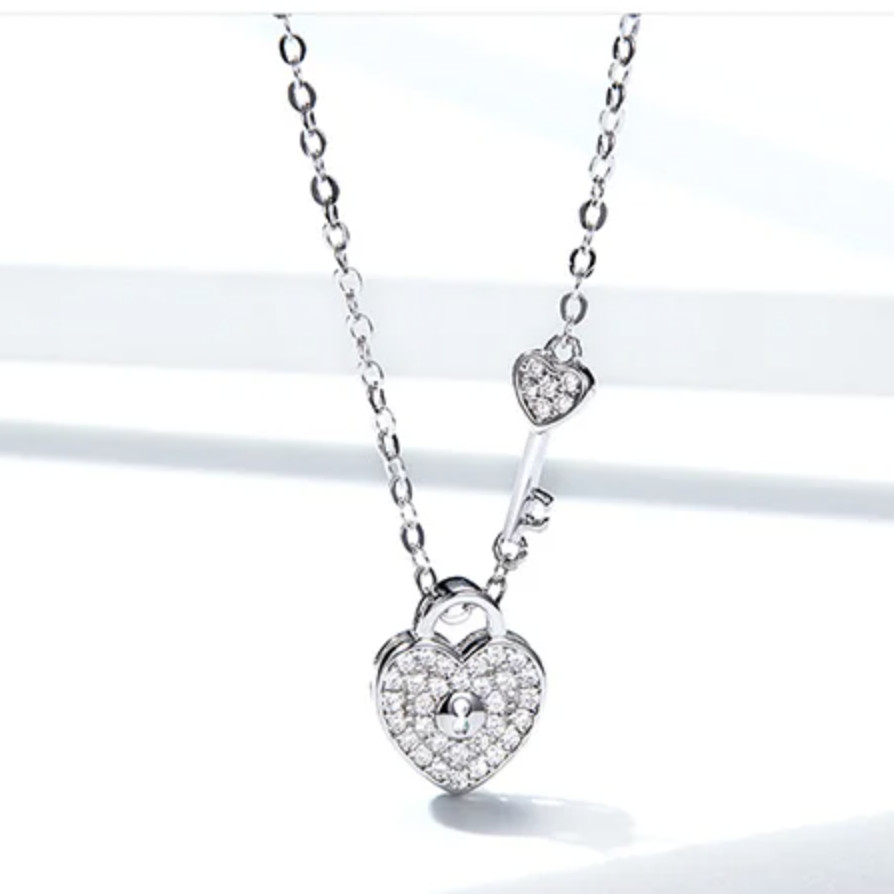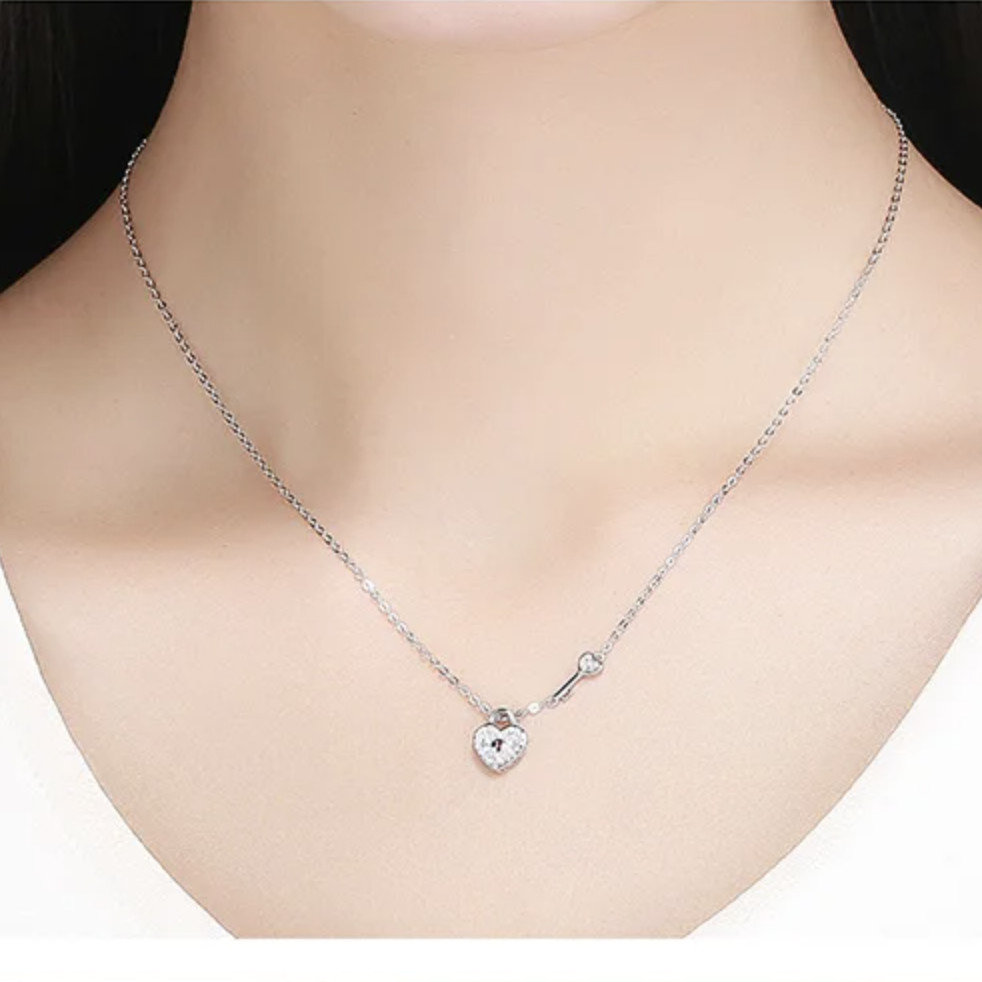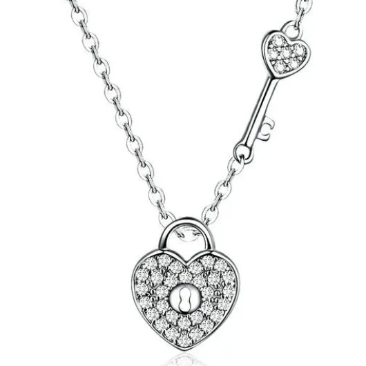 Strieborný náhrdelník, posiaty kamienkami, s príveskom v tvare srdca.