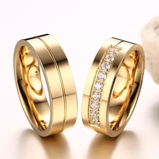 Dámsky svadobný prsteň vyrobený z nerezovej ocele, pozlátený, v strede zdobený drobnými bielymi kryštálmi zirkónu, . Šírka 6 mm, váha 5,1 g Snubná obrúčka je vyrobená z pevnej nerezovej ocele. Jeho farba je 100% odolná voči opotrebovaniu