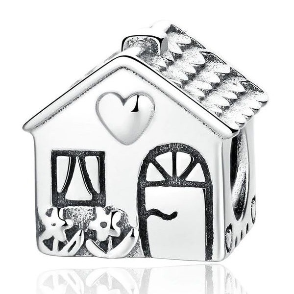 Prívesok domček vyrobený zo striebra, zdobený zirkónovými kryštálmi, na náramok alebo náhrdelník.