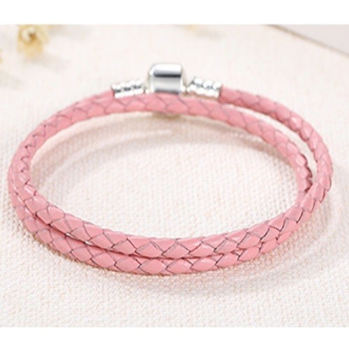 Pletený náramok, kožený, ružový, so strieborným zapínaním, 36 cm