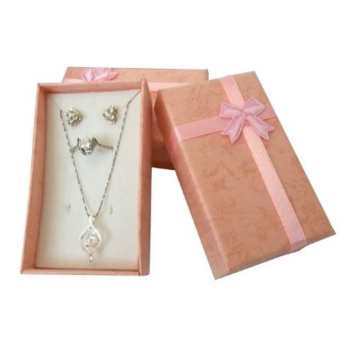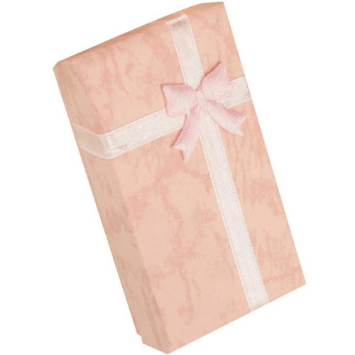 Obdĺžniková darčeková krabička na šperky, vyrobená z papiera, s mašľou na vrchnáku. Veľkosť 5 x 8 cm, výška 2,5 cm. Váži 13 g.