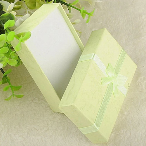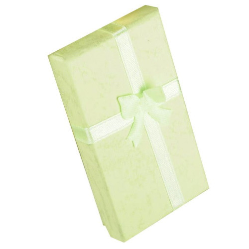 Obdĺžniková darčeková krabička na šperky, vyrobená z papiera, s mašľou na vrchnáku. Veľkosť 5 x 8 cm, výška 2,5 cm. Jeho hmotnosť je 13 g.