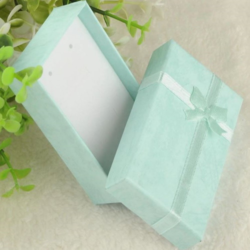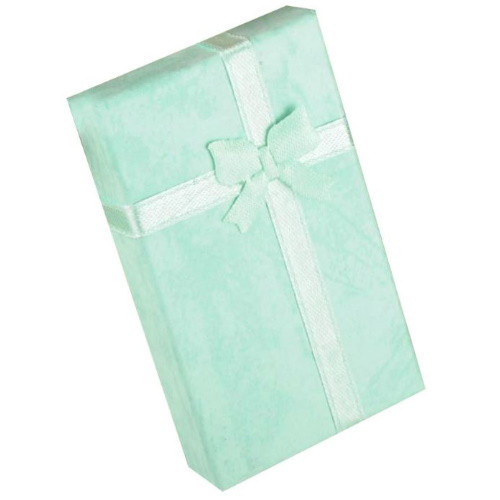Obdĺžniková darčeková krabička na šperky, vyrobená z papiera, s mašľou na vrchnáku. Veľkosť 5 x 8 cm, výška 2,5 cm. Jeho hmotnosť je 13 g.