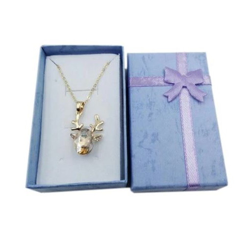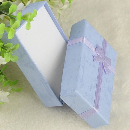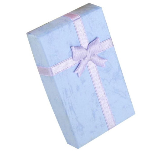Obdĺžniková darčeková krabička na šperky, vyrobená z papiera, s mašľou na vrchnáku. Veľkosť 5 x 8 cm, výška 2,5 cm. Váži 13 g.