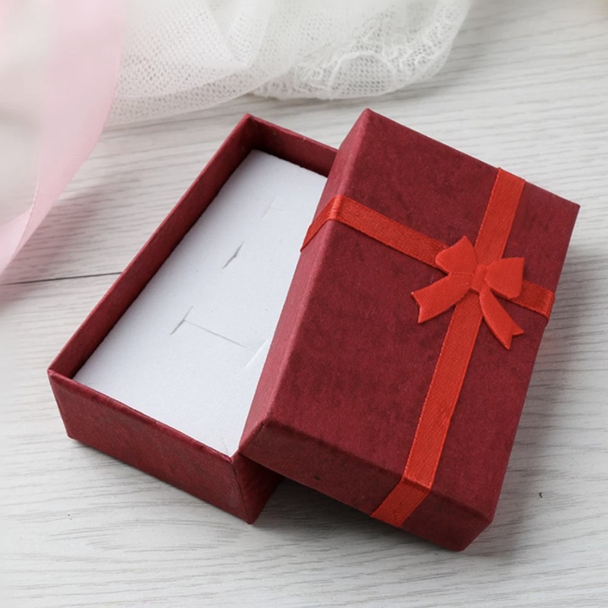 Obdĺžniková darčeková krabička na šperky, vyrobená z papiera, s mašľou na vrchnáku. Veľkosť 5 x 8 cm, výška 2,5 cm. Váži 13 g.