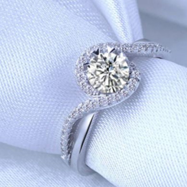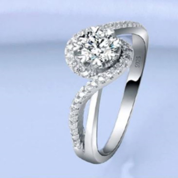 Elegantný zásnubný prsteň vyrobený zo striebra zdobený bielym zirkónovým kryštálom. Jeho najväčšia šírka je 0,9 cm, priemer veľkého zirkónového kryštálu je 0,6 cm.