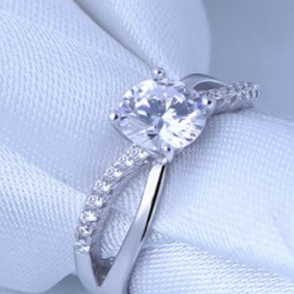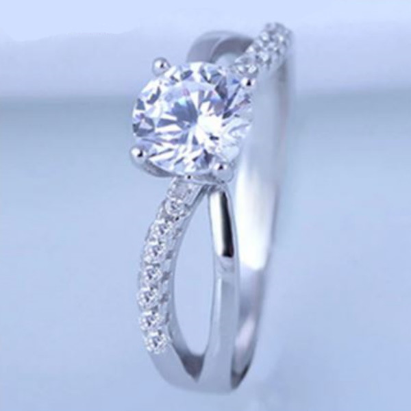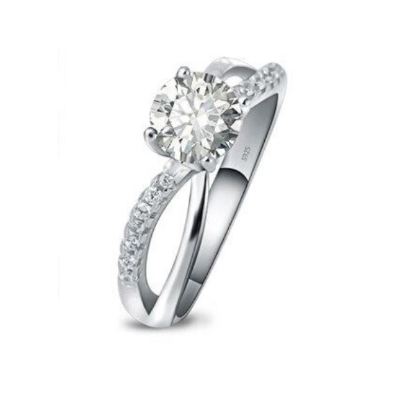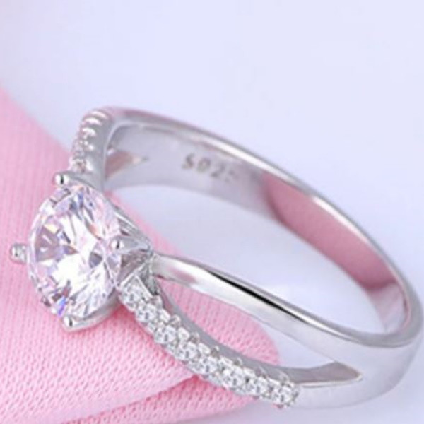 Elegantný zásnubný prsteň vyrobený zo striebra zdobený bielym zirkónovým kryštálom. Priemer veľkého zirkónového kryštálu je 0,6 cm.