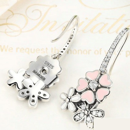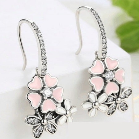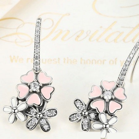 Strieborné náušnice z čerešňového kvetu s štrasovým vešiakom, ružové