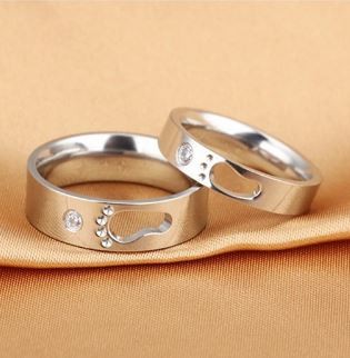 Pánska snubná obrúčka z nehrdzavejúcej ocele striebornej farby s ozdobou detskej nôžky a malým kamienkom zirkónu. Šírka prsteňa je 6 mm, váha je 5 g. Snubný prsteň je vyrobený z pevnej nerezovej ocele. Jeho farba je 100% odolná proti opotrebovaniu