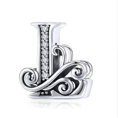 Strieborný prívesok s písmenom vo vintage štýle vykladaný drobnými bielymi zirkónovými kamienkami na náramok alebo náhrdelník.