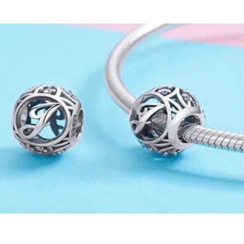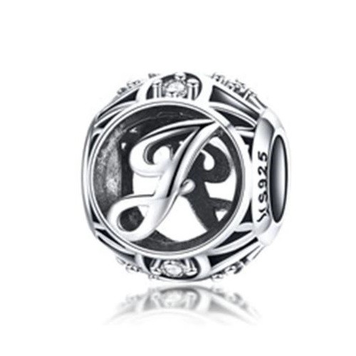 Detailný strieborný prívesok s písmenom vo vintage štýle, zdobený drobnými kamienkami zirkónu, na náramok alebo náhrdelník.