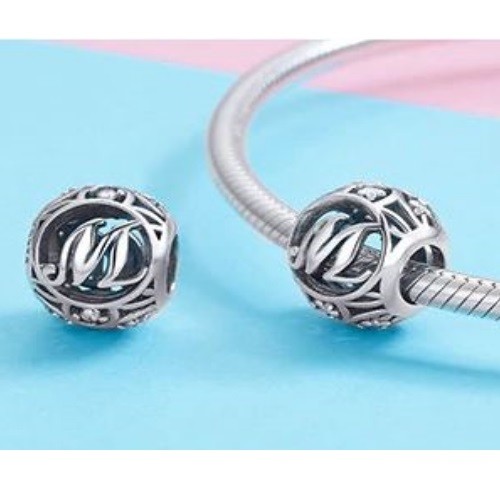 Detailný strieborný prívesok s písmenom vo vintage štýle, zdobený drobnými zirkónovými kamienkami, na náramok alebo náhrdelník.