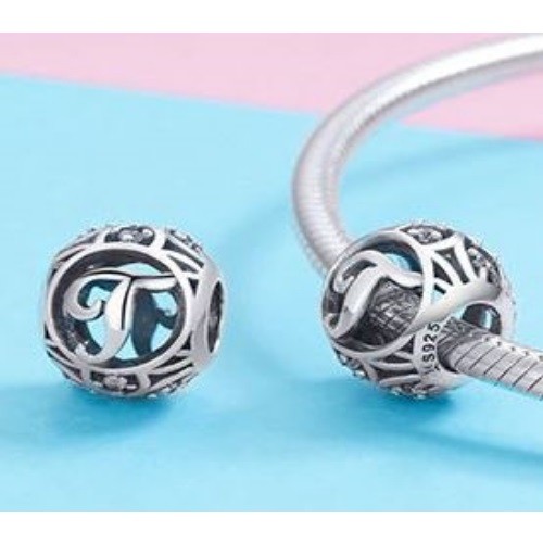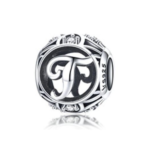 Detailný strieborný prívesok s písmenom vo vintage štýle, zdobený drobnými zirkónovými kamienkami, na náramok alebo náhrdelník.